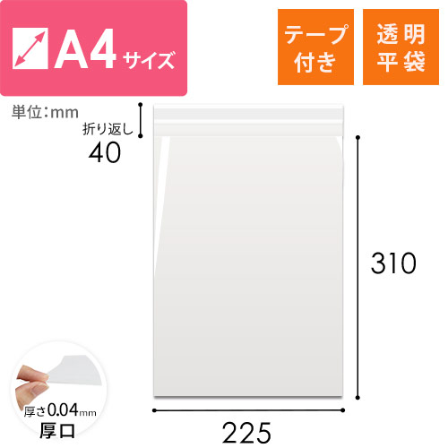 DM発送によく使われる厚さ0.04mmの材質を使用したA4サイズのテープ付き透明OPP袋。コシのある厚口のフィルムで強度があります。重たいものやかさばるものの梱包におすすめです。