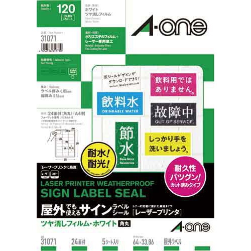 耐水・耐光性に優れた屋外用ツヤ消しホワイトフィルムラベル。A4サイズ、24面、5枚入り。