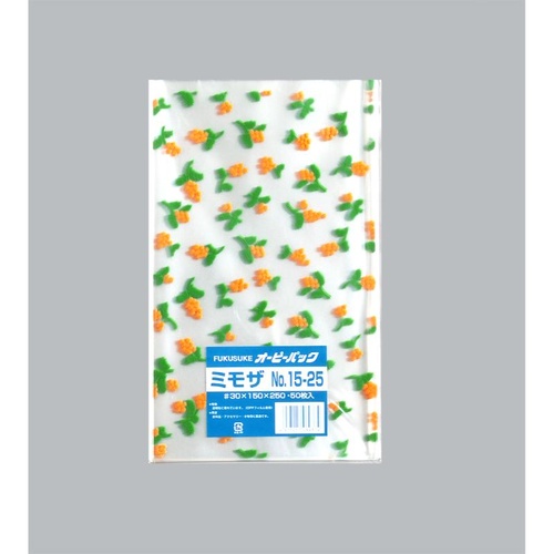福助工業製のテープ無OPP袋。優しいミモザ柄が商品を引き立て、生鮮食品から雑貨まで幅広く対応。店舗の品格を高めます。