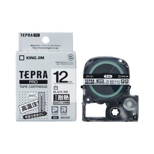 電子部品や工場設備の表示に最適な耐熱白ラベル。12mm幅、黒文字。200℃で約10時間耐えられます!
