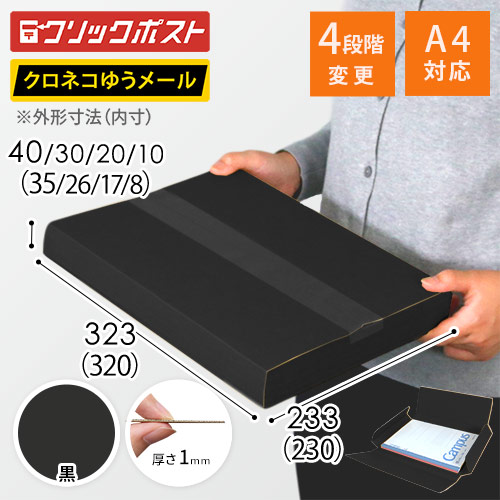 表面に黒色のカラーライナーを使用したメール便ケース。高級感ある見た目に仕上がるため、通販商品の発送やパッケージなどにおすすめです。