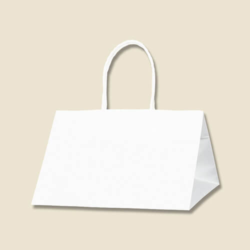 底面27cm角の正方形で出し入れスムーズな手提げ紙袋。白色無地で、和洋菓子など箱もの商品のギフト用や容器に入った食品の持ち帰り用としておすすめです。