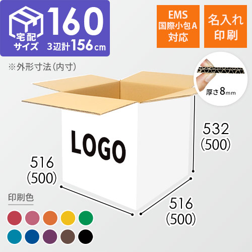 宅配160サイズのダンボールに、ロゴやイラストなどお客様ご希望のデザインを印刷できます。