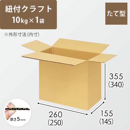 紐付クラフト10kg×1袋用のダンボール箱(宅配80サイズ)。内寸サイズは250×145×340mmで、紐付クラフト10kg×1袋の梱包にピッタリなサイズです。