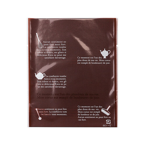 背面の茶色印刷がおしゃれなカマス袋。内寸は120×160mmです。お菓子が映えるデザインで季節を問わずご利用いただけます。