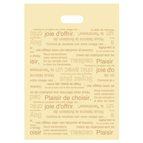 人気のカフェオレシリーズから、優しいクリーム色とフランス語がおしゃれなポリ手提げ袋。底マチ付きで様々な商品に対応します。