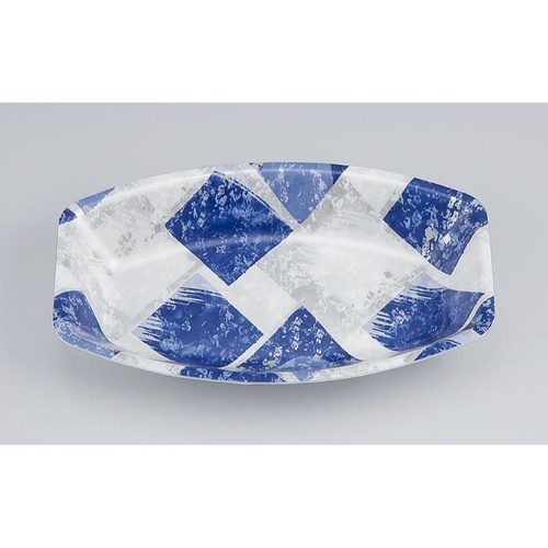 シーピー化成「V-舟唄」鮮魚トレー。氷角紺が鮮度と彩りを際立たせ、売場を上質に演出。軽量PSP製で取り扱いも簡単。
