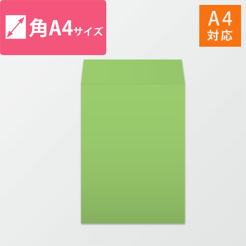 A4用紙がピッタリ入る、一般的な厚さの角A4封筒。色はグリーンで、シンプルな仕様です。書類・サンプル・小型商品の定形外郵便発送にいかがでしょうか。