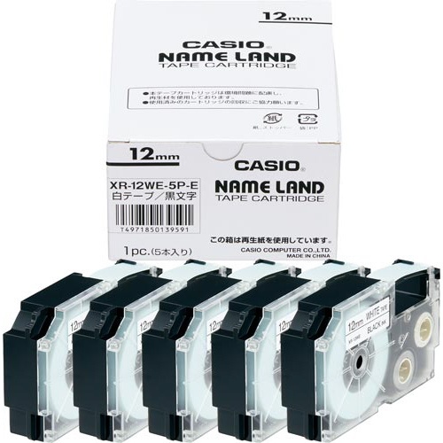 お得な5個パック!ネームランド用12mm幅の白テープ、黒文字。テープ長8m。