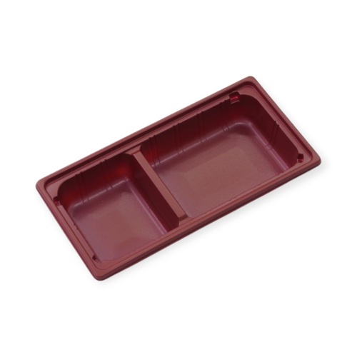 仕切り付きの赤色トレー。食品の区分けや盛り付けに最適。日本製SA素材でプロの現場をサポート。本体・蓋別売りです。