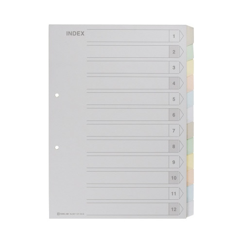 A4タテ、2穴、12山で書類の分類・整理に最適!再生紙を使用した環境にも配慮したインデックスです。