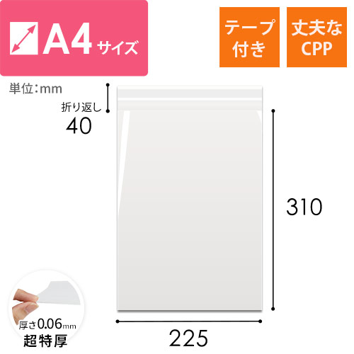 厚さ0.06mmの厚口で破れに強いCPP素材を使用したA4サイズのCPP袋。厚手で伸びるフィルムなので避けにくく、非常に強度があります。重たいものやかさばるものの梱包におすすめです。