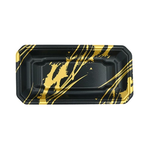 エフピコ製FLステージ鮮魚トレー。線ふで金デザインで、新鮮な魚介の彩りを一層引き立て、売場に上質な華やかさを演出します。