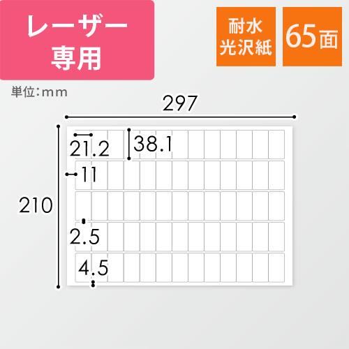 レーザープリンターに対応したA4サイズのシール用紙(耐水光沢紙)。1シートあたり21.2×38.1mmのラベルが65面付いています。