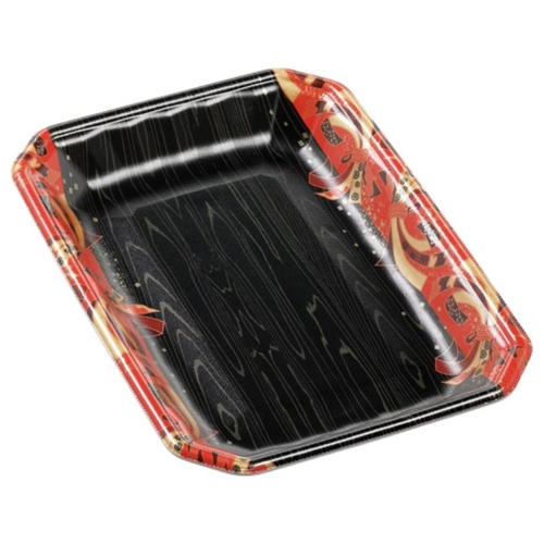 舞姫赤が彩る大容量発泡トレー「メガプレート」。精肉、鮮魚、惣菜からお弁当まで、商品を一層魅力的に見せます。