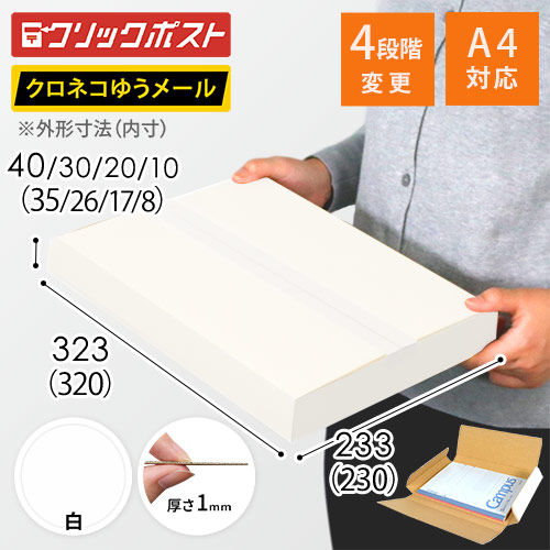 クロネコゆうメール・ゆうパケット対応!A4サイズ・厚さ2cmの白色メール便ケース。テープレス仕様で梱包・発送の作業も簡単。