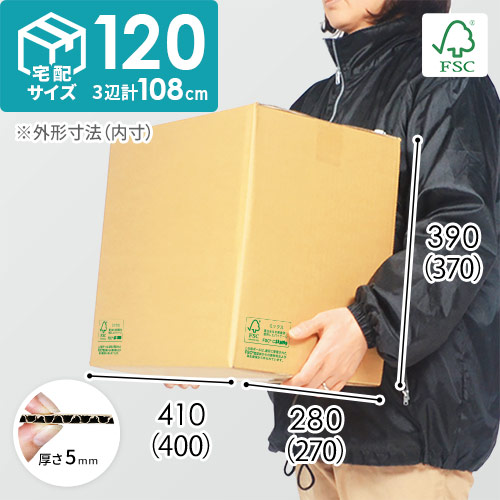 FSC認証紙を利用したダンボール箱。宅配120サイズに対応しています。森林保全につながるFSCラベル付きの製品です。