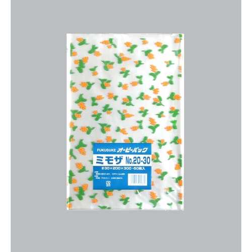福助工業製のテープ無OPP袋。優しいミモザ柄が商品を引き立て、生鮮食品から雑貨まで幅広く対応。店舗の品格を高めます。