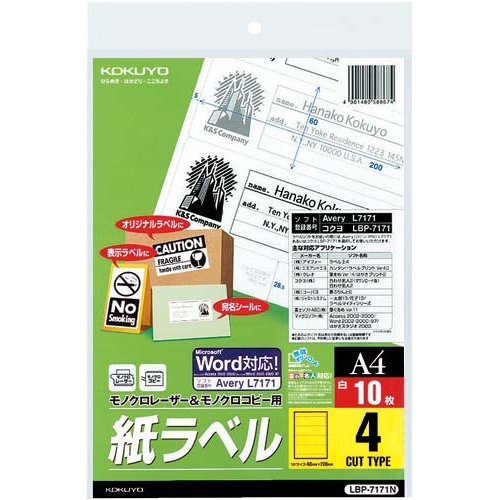 コクヨのモノクロレーザー用紙ラベル A4 4面。10枚×5冊セットでたっぷり使えます。