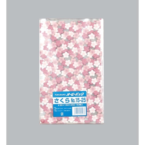 福助工業のOPP袋『さくら』。150x250mm、厚み30μ。透明感と『さくら』柄が、商品を上品に演出し、陳列シーンを魅力的に彩ります。