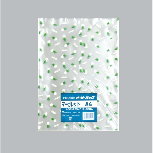 福助工業のテープ無しA4サイズOPP袋。食品衛生法対応のシンプルマーガレット柄で、書類から食品まで幅広く対応します。