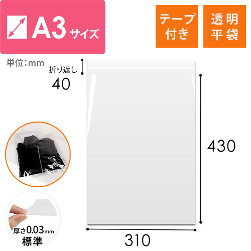A3が入る大きさで、静電気防止加工されたテープ付きの透明OPP袋。標準的な厚さ0.03mmの袋で、パリッとした質感や透明度の高さが特徴です。洋服のラッピングや商品梱包などにいかがでしょうか。