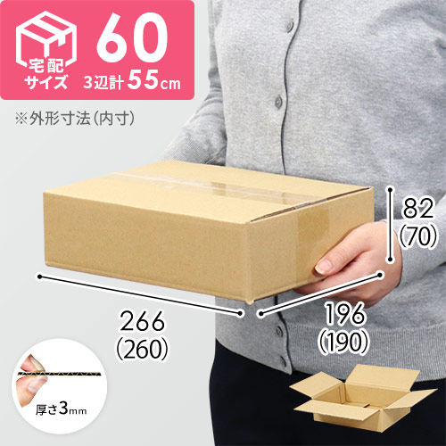 内寸260×190×70mmで、宅配60サイズに対応したダンボール箱。食品・飲料・お酒類を扱うお客様におすすめの仕様です!