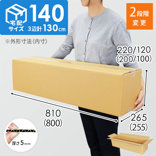 宅配120・140サイズで発送可能な可変式のダンボール箱。折り畳み式の釣り竿や小さめのラグといった長尺の商品に。高さを調節できるので、緩衝材の節約にも繋がります。