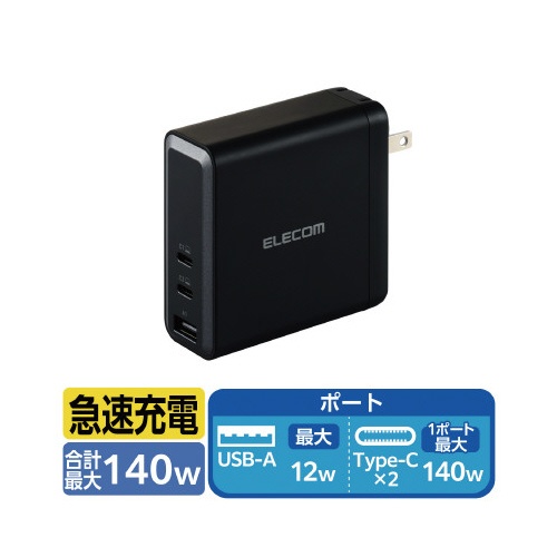 16インチMacBook Proも高速充電可能な、USB PD EPR 140W出力対応のAC充電器です。Type-C×2、A×1ポート搭載。