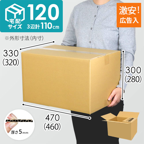 「ダンボールワン」の広告が印刷されたダンボール箱。宅配120サイズに対応しています。底面はA3サイズが入る大きさです。