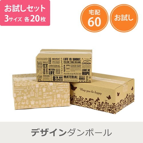 おしゃれなデザインが印刷された宅配60サイズの段ボール3種各20枚(60枚)のお試しセットです。※DS-60、DSB-60、DSBK-60の3種類