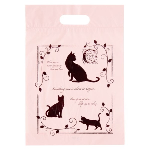 甘いピンクに黒猫シルエットが上品な、小判抜きポリ手提げ袋。女性のお客様に喜ばれるエレガントなデザインです。