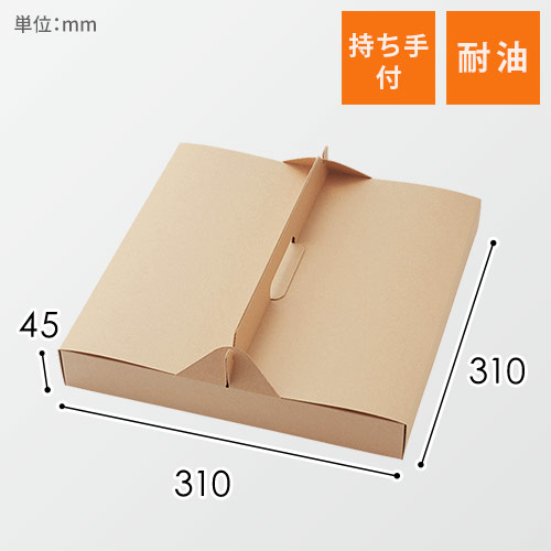12インチ(約30cm)のピザが入るピザ用ボックス(持ち手付き)。サイズが310×310×高45mmで、クラフト無地タイプ。内側に耐油加工あり。