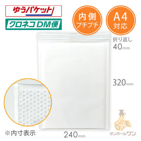 【ダンボールワンオリジナル】クロネコDM最大のA4サイズ!内側エアーキャップ(気泡緩衝材)付きの白色クッション封筒。