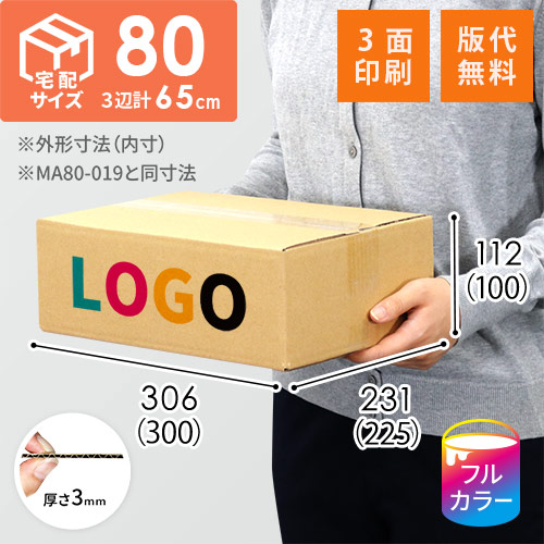 【ロゴ印刷・フルカラー・3面】宅配80サイズ ダンボール箱(300×225×100mm)3mm B/F C120×C120
