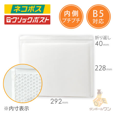 【ダンボールワンオリジナル】ネコポス最大のB5サイズ!内側エアーキャップ(気泡緩衝材)付きの白色クッション封筒。