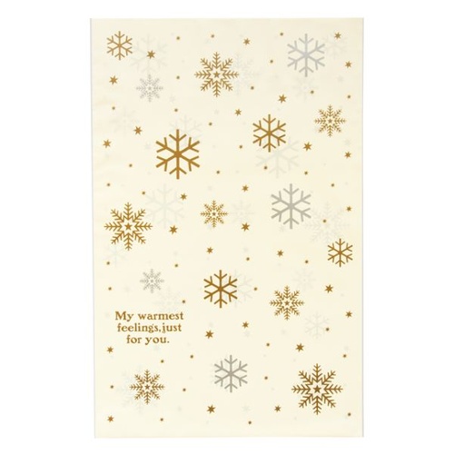 上品な雪の結晶デザインで、クリスマスや冬のギフトにぴったりのOPPバッグ。中身が見えにくい全面デザインで特別な贈り物を演出します。