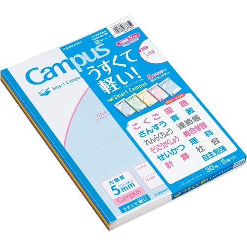 セミB5、5mm方眼のスマートキャンパスノート5冊パック。科目シール付きで便利!