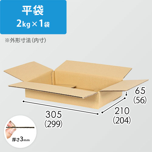 平袋2kg×1袋用のダンボール箱(宅配60サイズ)。内寸サイズは299×204×56mmで、平袋2kg×1袋の梱包にピッタリなサイズです。