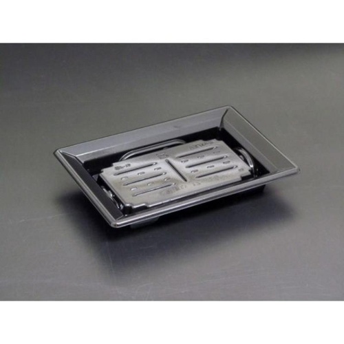 鮮魚や惣菜を美しく魅せる金本体容器。スッキリとしたフォルムが料理を引き立て、安定した積み重ねで陳列も快適。