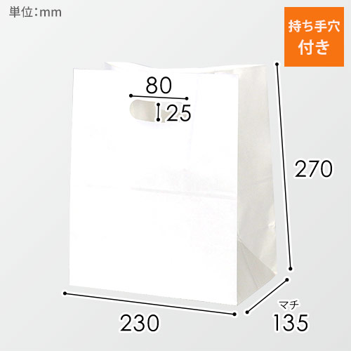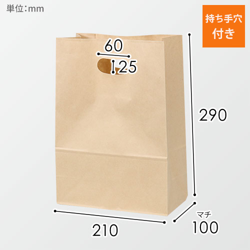 店頭でのテイクアウトに最適な持ち手付き角底袋。手穴が丸くくり抜かれており持ちやすい仕様です。お惣菜や雑貨のお持ち帰りにいかがでしょうか。