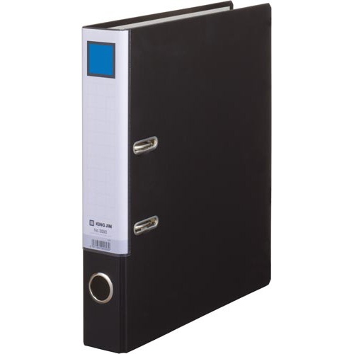 A4タテ型、黒のレバーアーチファイル。300枚収容、背幅53mm(とじ厚30mm)。