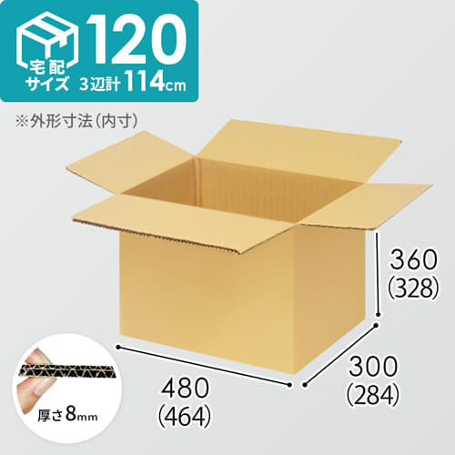 1100×1100mmのパレットに8面×5段積める、納品向けダンボール箱。内寸は464×284×328mmで、宅配120サイズに対応しています。