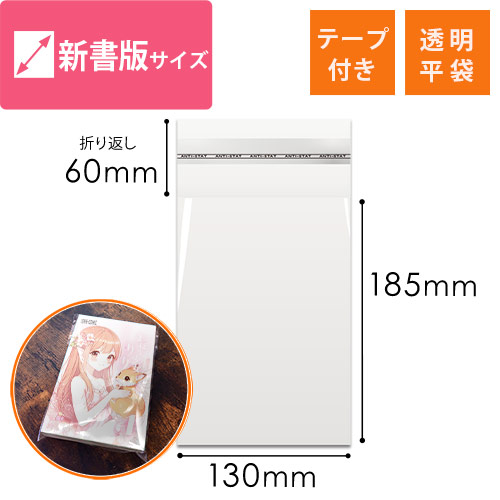 青年コミック用の静電気防止加工されたテープ付きOPP袋です。0.03mm厚の透明でパリッとした質感が特徴。コミックスや小物などの梱包に最適です。