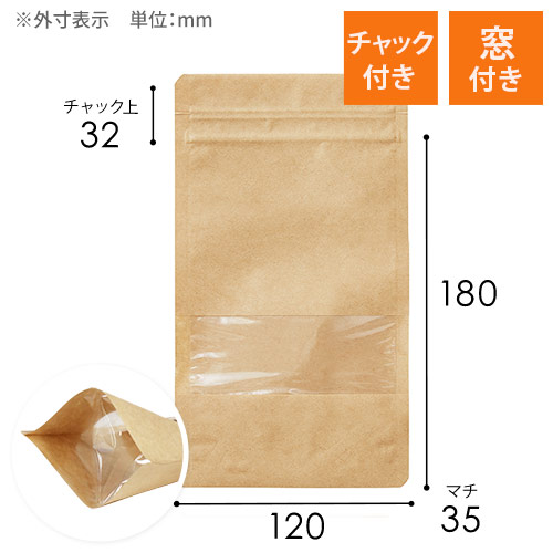 チャック付きでクラフト素材のスタンド袋。内容物が確認しやすい窓付きで、カラフルなパスタやドライフルーツなど形状にこだわった商品に最適です。