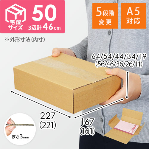 深さを5段階に調節できる底面A5のダンボール箱。ゆうパケットなどのメール便〜宅配60サイズに対応しており、取り扱いサイズや豊富なショップ様におすすめです。