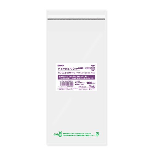 植物由来のバイオマス成分が含まれたOPP袋です。Tシリーズは作業性の良いテープ付でワンタッチで封ができます。食品衛生法規格基準適合商品です。