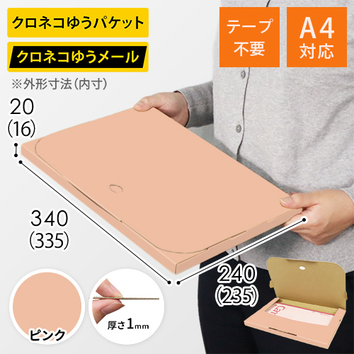 表面にピンク色のカラーライナーを使用したメール便ケース。高級感ある見た目に仕上がるため、通販商品の発送やパッケージなどにおすすめです。