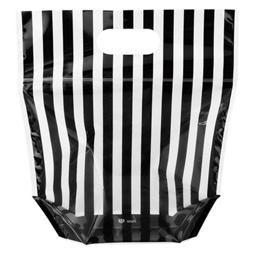 シンプルな白黒ストライプが特徴のジップ付きスタンドバッグです。高級感あるギフトから食品まで、幅広く使える日本製の優れものです。