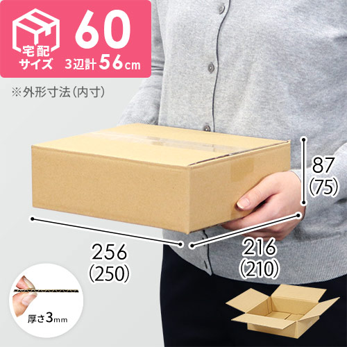内寸250×210×75mmで、宅配60サイズに対応したダンボール箱。書籍や映像・音楽ソフトを扱うお客様におすすめの仕様です!
